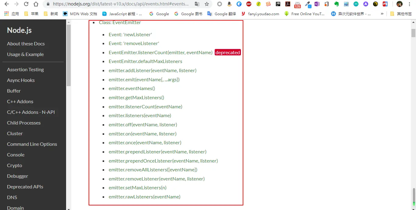 回到node官方文档,在列表中看到有Event模块,模块里有个类叫做EventEmitter。这是node的核心模块之一,很多类是基于这个EventEmitter类的。
