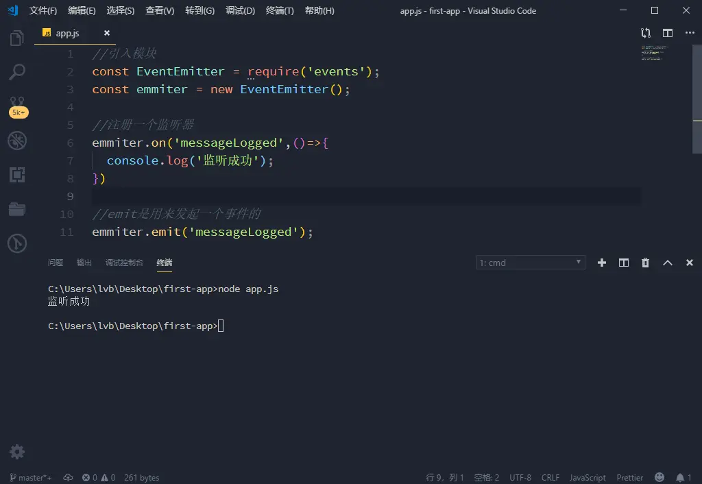 最后在app模块中,之前使用EventEmitter的对象,现在可以使用新的类定义一个实例对象。这个类扩展自EventEmitter类。