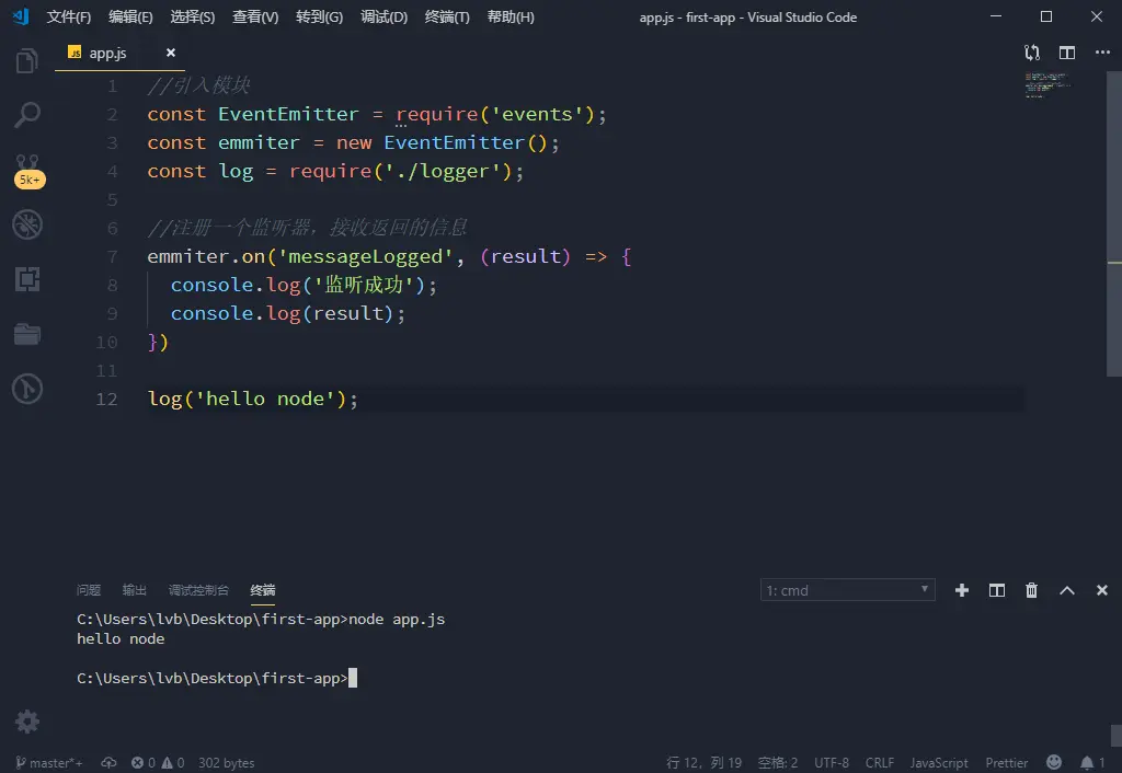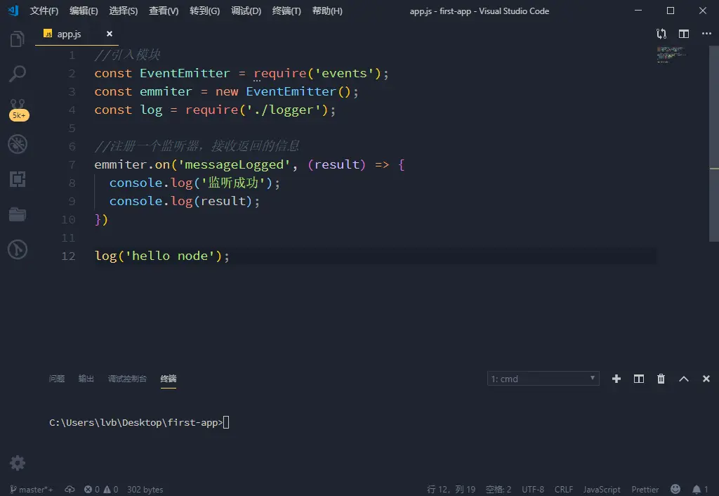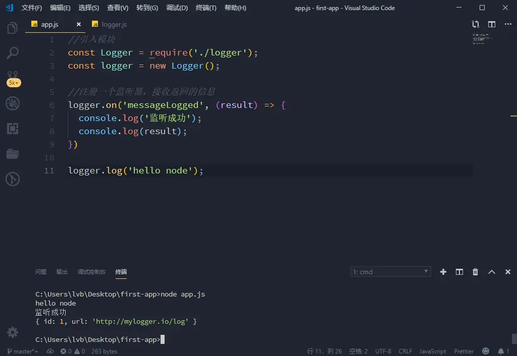 app模块中我想监听然后做点事。导入EventEmitter到模块中,创建实例对象在应用中使用。在logger模块中发起事件。