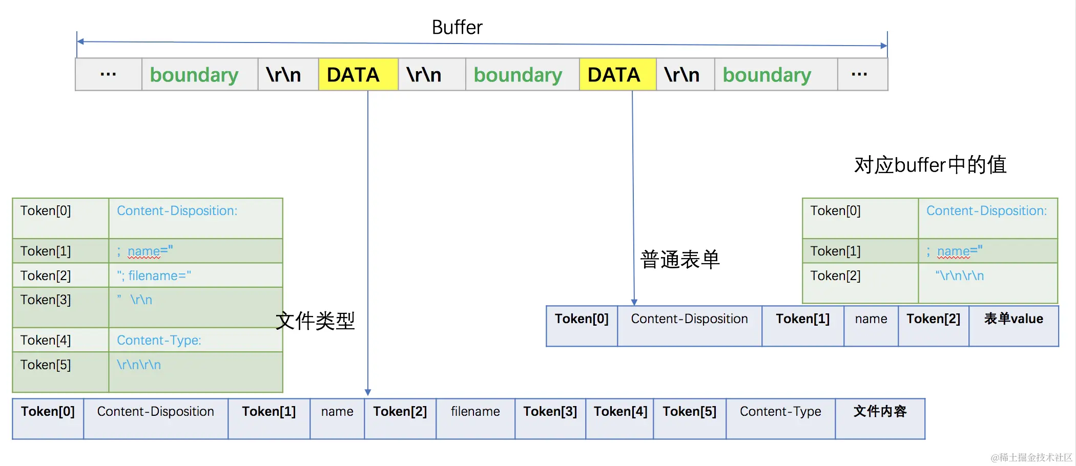 将上传的数据分解成数据段,每个数据段对应着表单中的一个 Input 区。对每个数据段,再进行分解,提出上述要求得到的内容。