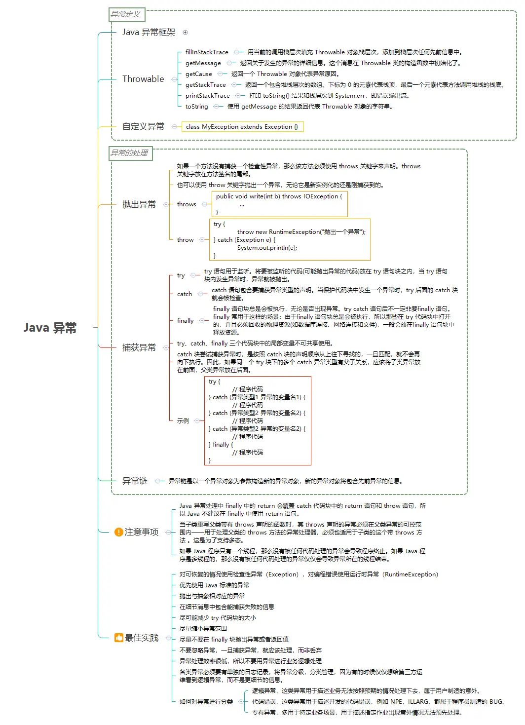 fillInStackTrace- 用当前的调用栈层次填充Throwable对象栈层次,添加到栈层次任何先前信息中。getMessage- 返回关于发生的异常的详细信息。这个消息在Throwable类的构造函数中初始化了。getCause- 返回一个Throwable对象代表异常原因。getStackTrace- 返回一个包含堆栈层次的数组。下标为 0 的元素代表栈顶,最后一个元素代表方法调用堆栈的栈底。printStackTrace- 打印toString()结果和栈层次到System.err,即错误输出流。toString- 使用getMessage的结果返回代表Throwable对象的字符串。