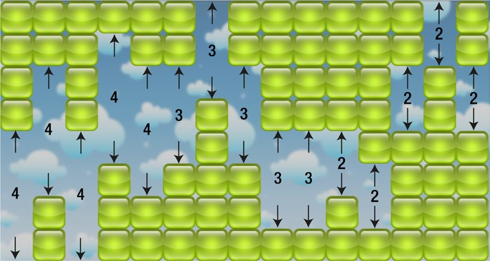 游戏中有15根柱子,想要通关,小精灵必须通过这些柱子。每5根柱子,顶部和底部之间的间隙会变得更窄。前5个柱子有四块的间隙,接下来的5根柱子有三块的间隙,后5根柱子有两块的间隙。随着小精灵飞得更远,游戏也变得越来越困难。每根柱子的间隙的确切位置是随机的,并且每次玩游戏时都是不同的。而每个柱子与柱子间隔384像素,下图显示了它们彼此相邻时的样子。