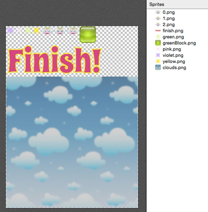 代码的最后一部分将 finish 精灵添加到 blocks 容器中,blocks 容器最后会添加到舞台上,小精灵如果能坚持到最后,就能看见它。