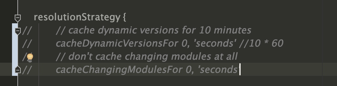 在 Gradle 中,最好固定依赖的版本号,这样就不会每次编译都重新拉依赖,但是在目前快速迭代的背景下,一般都是锁死第一位,第二位和第三位版本号自动更新,也没法锁死依赖,只能把之前 resolutionStrategy 改一下,使用 Gradle 默认的动态版本号缓存策略(Gradle 的动态版本也会有缓存滴),改动如下: