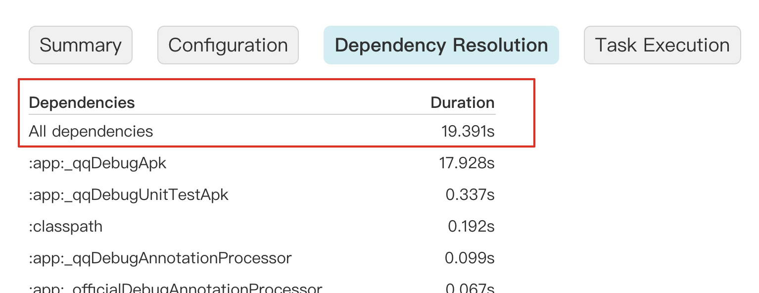 Gradle 在构建时都会去拉依赖,顺序是:本地缓存 -> 远程依赖。如果使用了动态版本,那么每次 Gradle 都会拉最新的依赖,在依赖多的情况下是非常耗时的,从下面这张图可以看出(挖财宝):