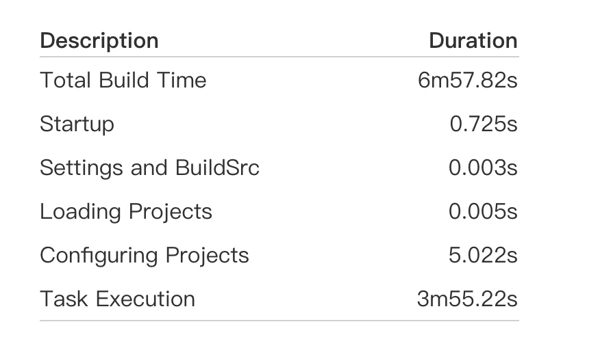 本地构建的时候一次需要比较长的时间,存在优化空间。可以使用 --profile 参数来分析构建过程中各个任务的耗时情况,比如 ./gradlew assembleDebug --profile