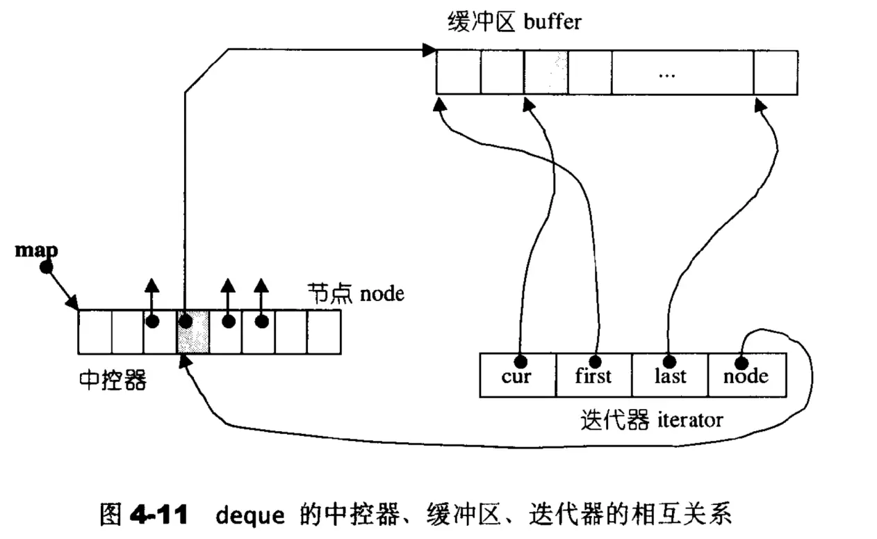 - map是一块连续空间,每个元素指向另一段较大的连续空间即buffer,被指向的连续空间是deque的存储主体