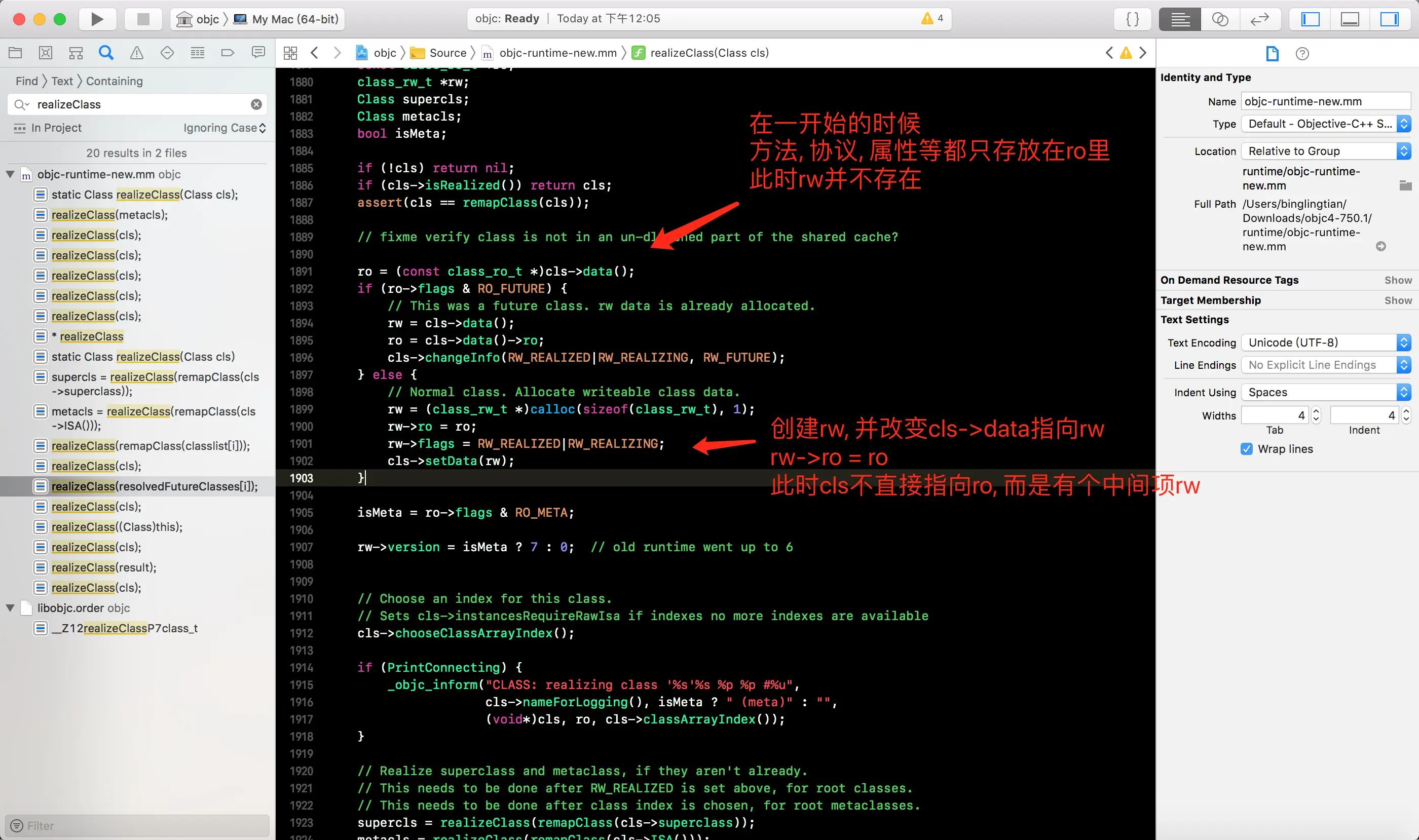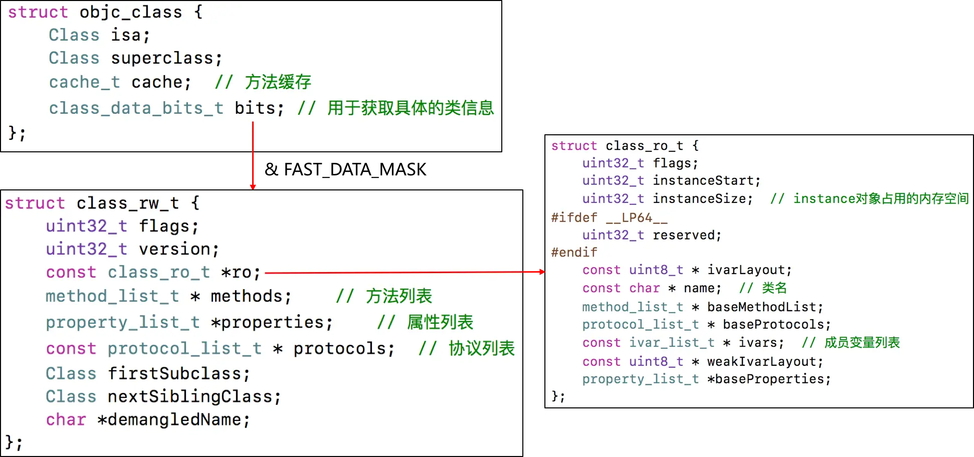class_data_bits_t bits;指向ro, 在加载的过程中创建了rw, 此时的指向顺序是bits->rw->ro