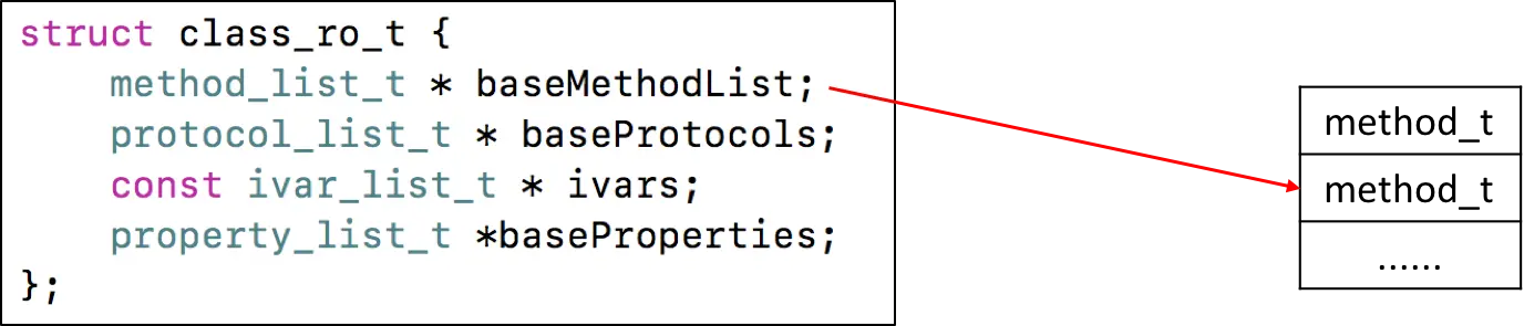 class_ro_t里面的baseMethodList、baseProtocols、ivars、baseProperties是一维数组,是只读的,包含了类的初始内容