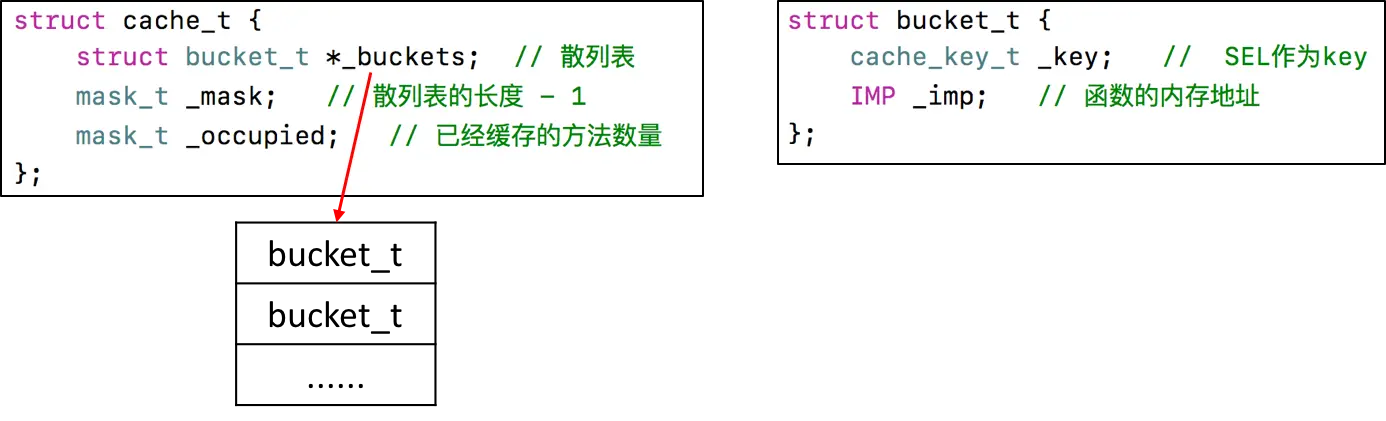 Class内部结构中有个方法缓存(cache_t),用散列表(哈希表)来缓存曾经调用过的方法,可以提高方法的查找速度