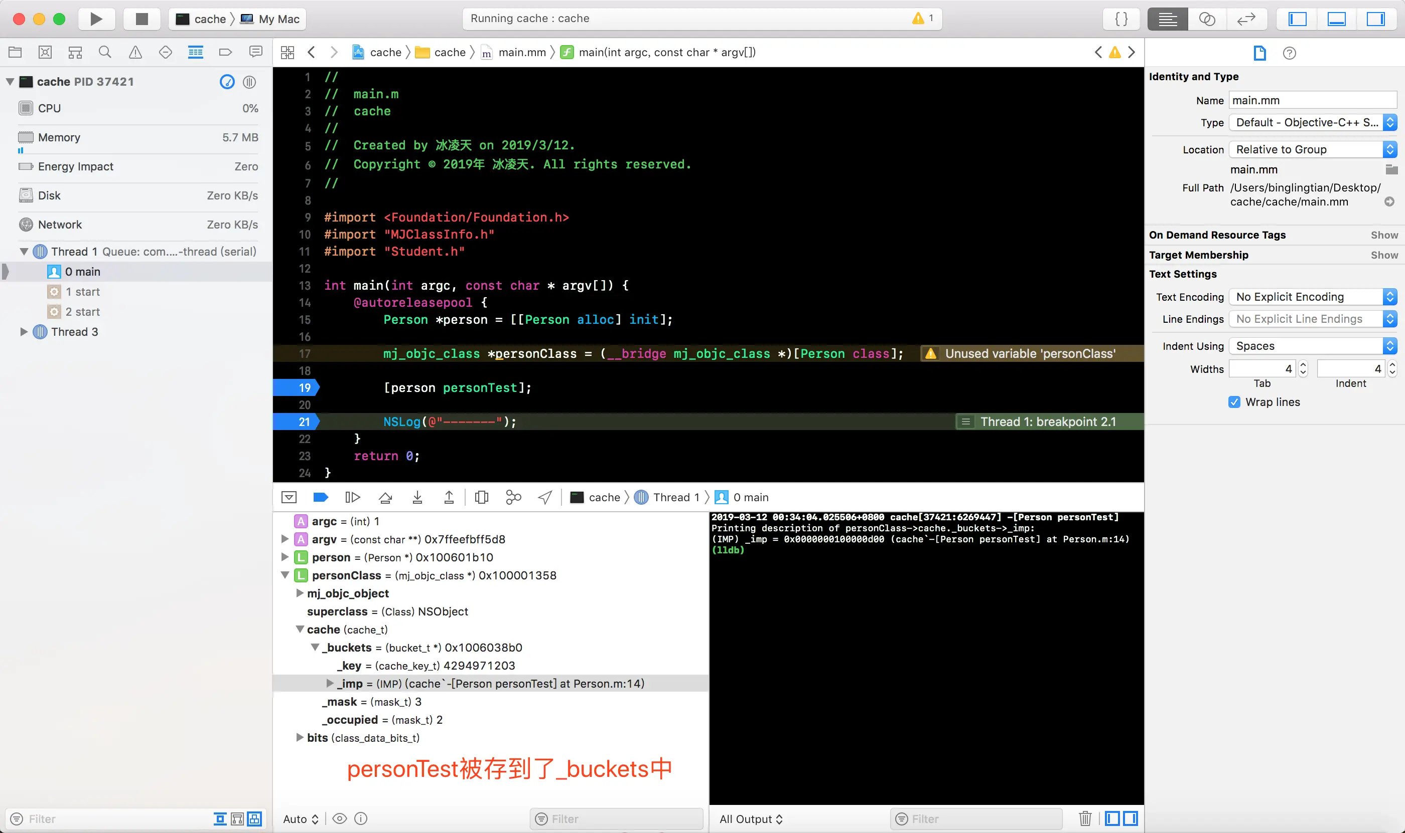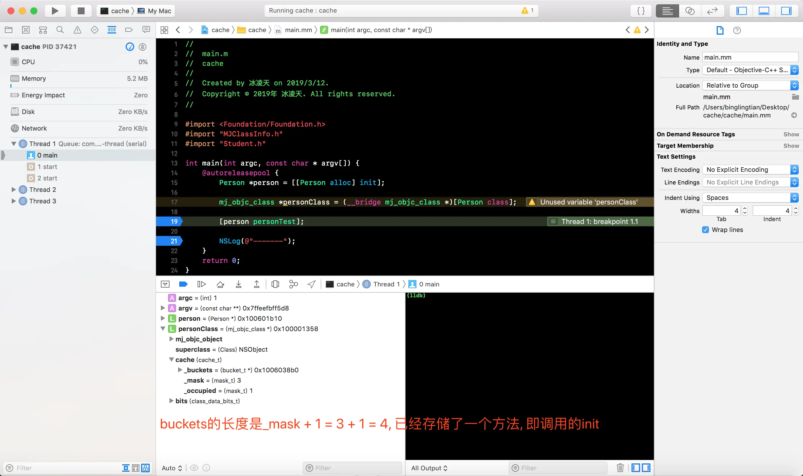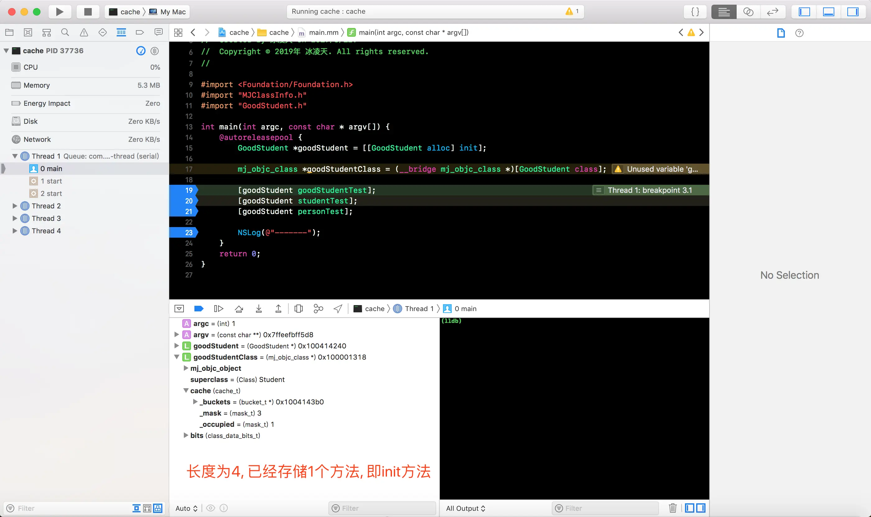 personClass的结构吗可以看到cache中的_buckets长度是_mask + 1 = 4, 此时已经存储一个方法, 即刚调用过的init方法
