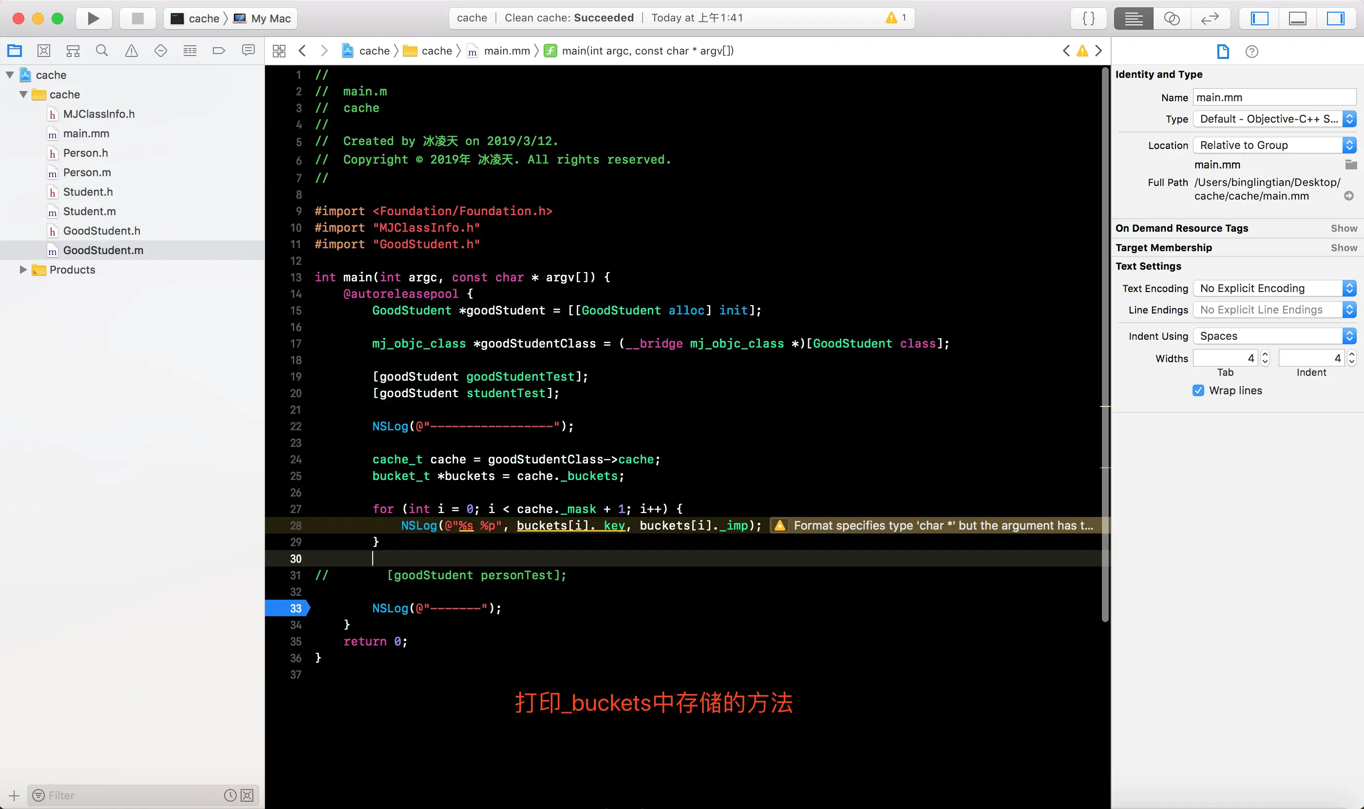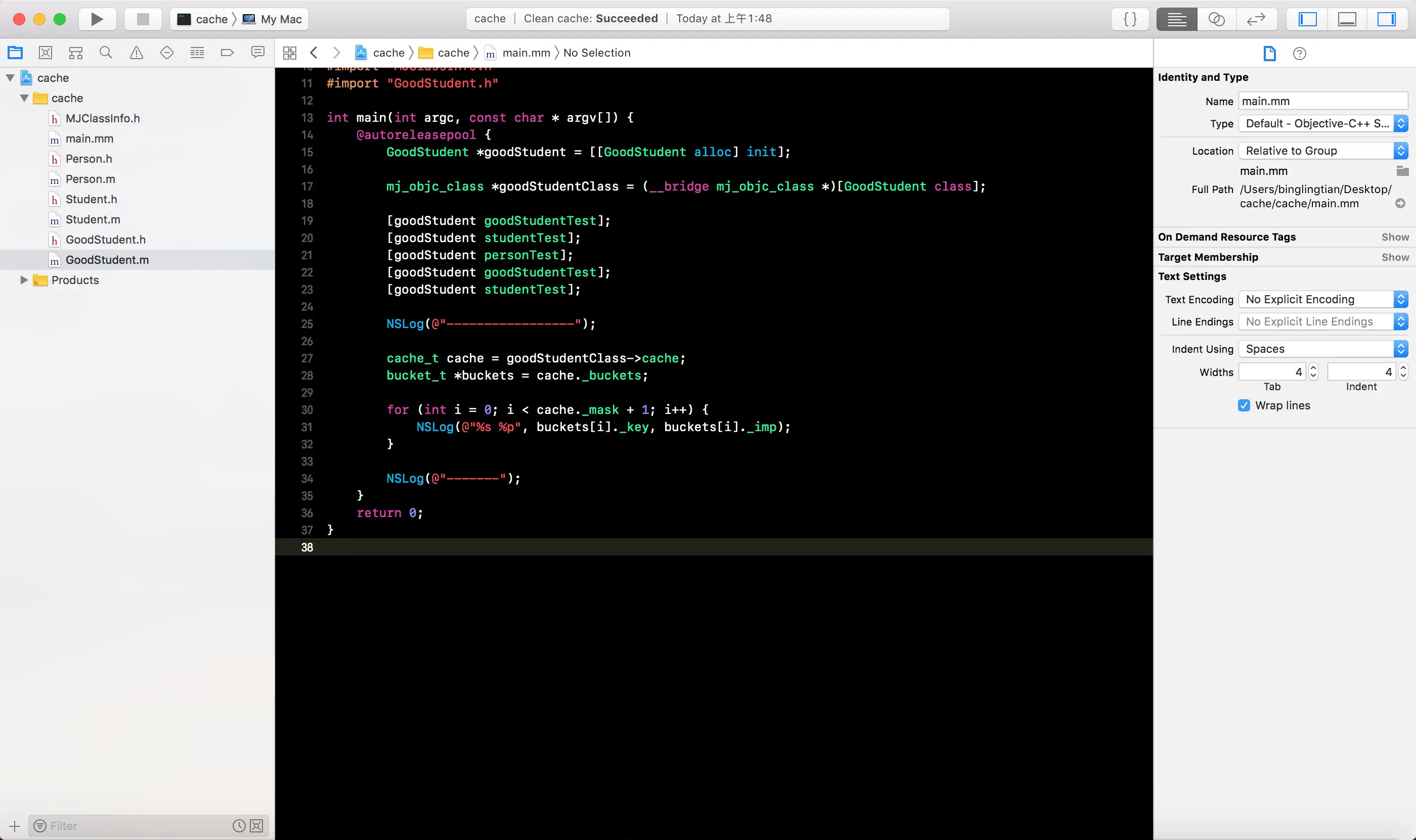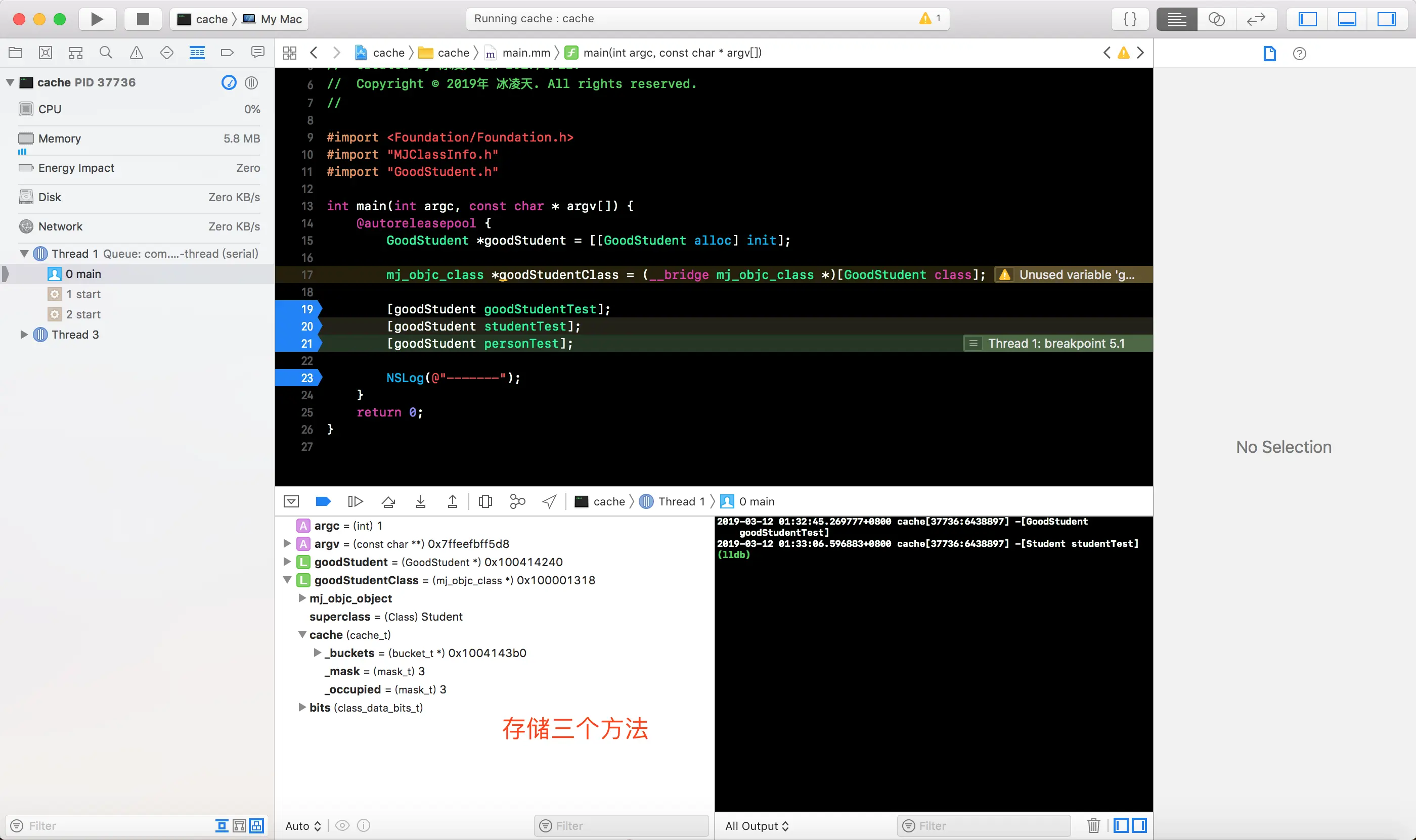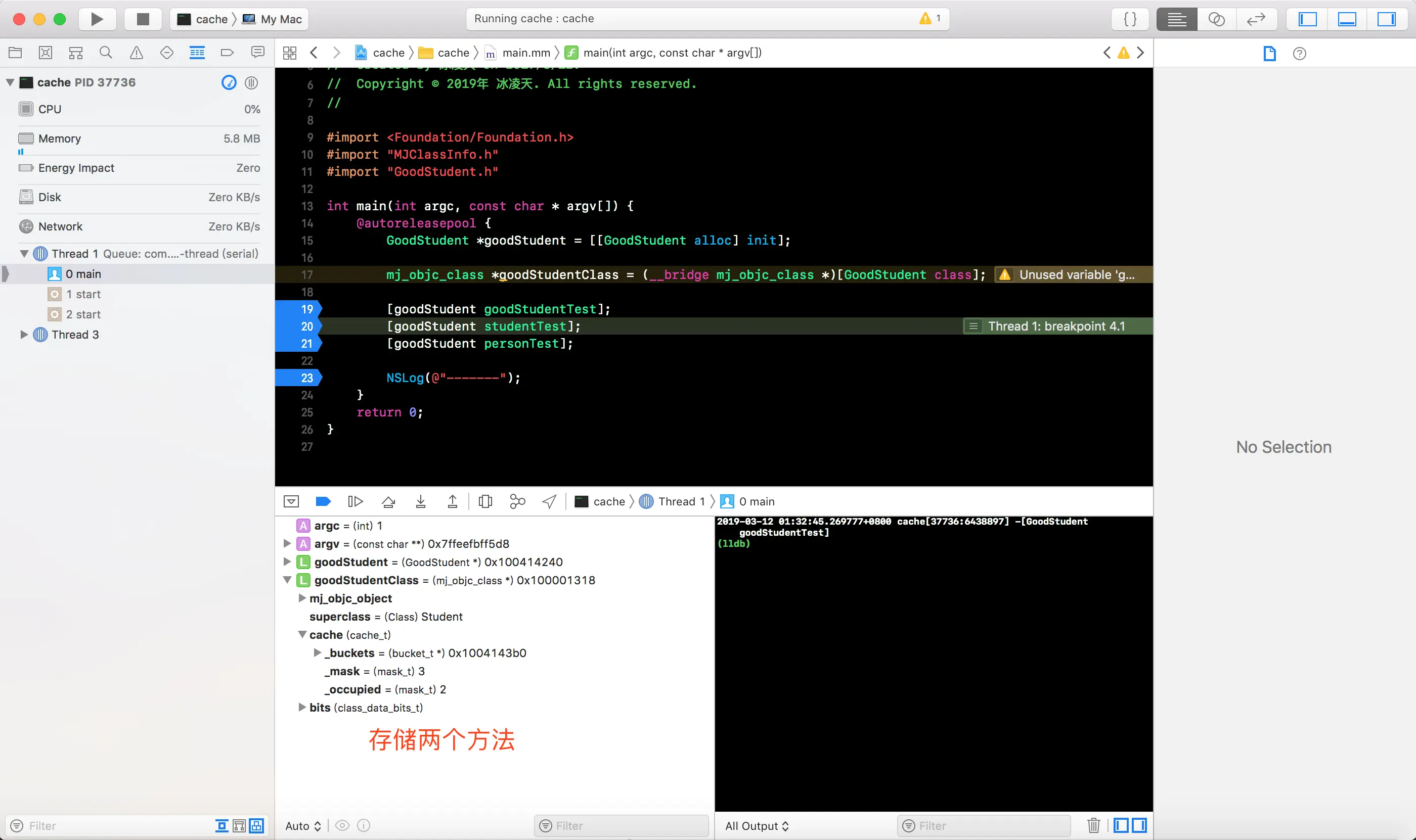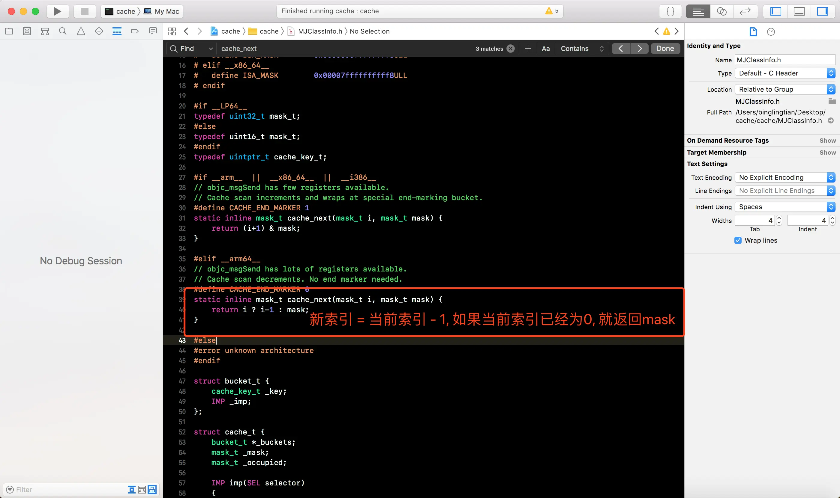 Student实例调用learning方法时, 就会用@selector(learning) & _buckets.mask来获取存储的索引,然后将learning方法存放到Student类对象的cache中 - 假设获取到的索引值为