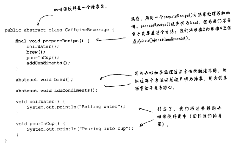 public abstract class CaffeineBeverage { final void prepareRecipe() { boilWater(); brew(); pourInCup(); addCondiments(); } abstract void brew(); abstract void addCondiments(); void boilWater() { System.out.println("Boiling water"); } void pourInCup() { System.out.println("Pouring into cup"); } } -