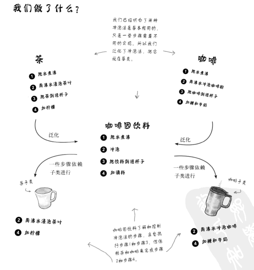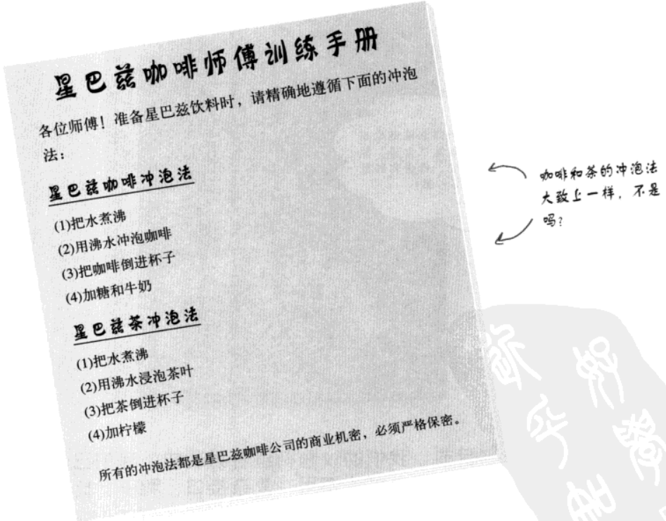 - 仔细观察 , 冲泡步骤的 第二和第四步实质上是一样的, 只是对于不同的饮料有不同的实现. 我们可以把 它们也进行抽象吗?
