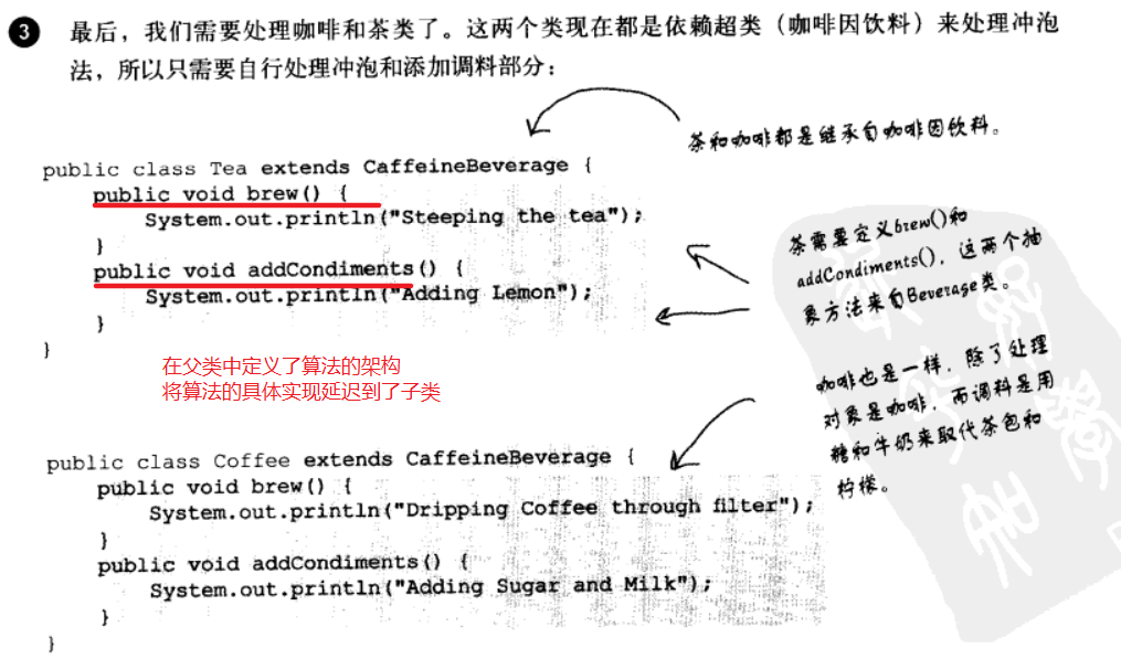 public class Coffee extends CaffeineBeverage { public void brew() { System.out.println("Dripping Coffee through filter"); } public void addCondiments() { System.out.println("Adding Sugar and Milk"); } } -
