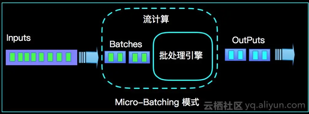 Micro-Batching 计算模式认为 "流是批的特例", 流计算就是将连续不断的批进行持续计算,如果批足够小那么就有足够小的延时,在一定程度上满足了99%的实时计算场景。那么那1%为啥做不到呢?这就是架构的魅力,在Micro-Batching模式的架构实现上就有一个自然流数据流入系统进行攒批的过程,这在一定程度上就增加了延时。具体如下示意图: