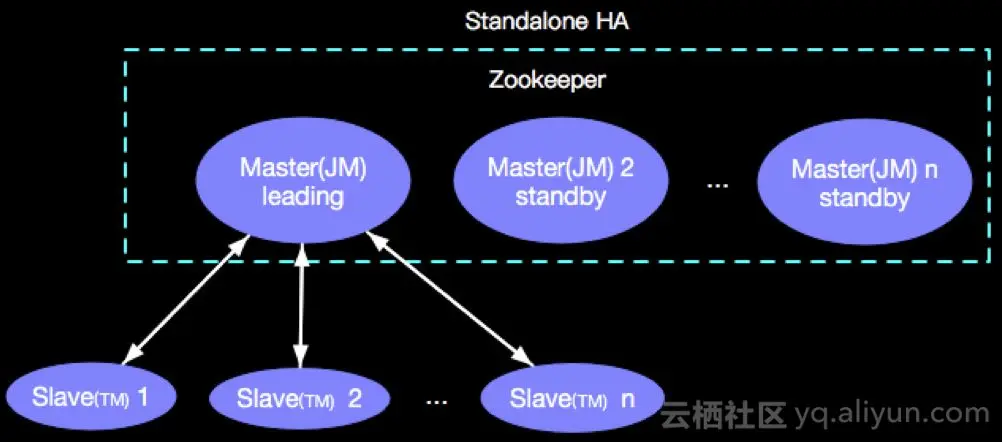 其中JM(JobManager)是Master,TM(TaskManager)是Slave,这种Master/Slave模式有一个典型的问题就是SPOF(single point of failure), SPOF如何解决呢?Apache Flink 又提供了HA(High Availability)方案,也就是提供多个Master,在任何时候总有一个JM服役,N(N>=1)个JM候选,进而解决SPOF问题,示意如下:
