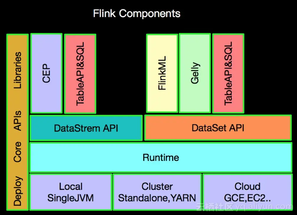 Apache Flink 按不同的需求支持Local,Cluster,Cloud三种部署模式,同时Apache Flink在部署上能够与其他成熟的生态产品进行完美集成,如 Cluster模式下可以利用YARN(Yet Another Resource Negotiator)/Mesos集成进行资源管理,在Cloud部署模式下可以与GCE(Google Compute Engine), EC2(Elastic Compute Cloud)进行集成。