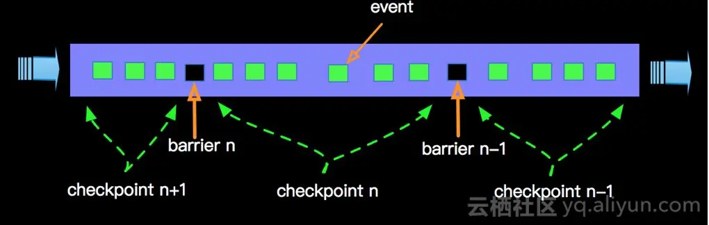 Apache Flink Checkpointing的内部实现会利用 Barriers,StateBackend等后续章节会详细介绍的技术来将数据的处理进行Marker。Apache Flink会利用Barrier将整个流进行标记切分,如下示意图: