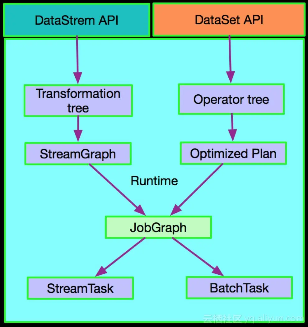 对于流任务最终会转换成DataStream,对于批任务最终会转换成DataSet。