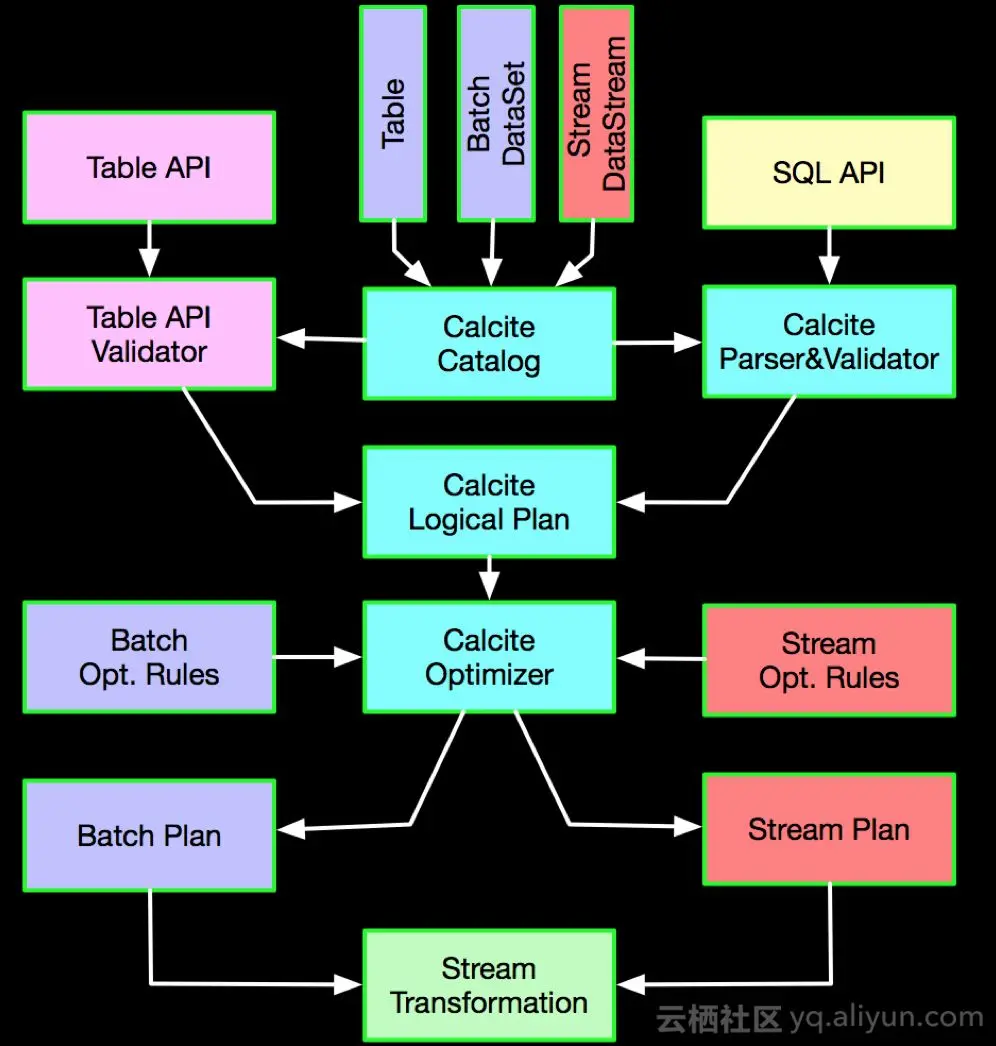 TableAPI&SQL最终会经过Calcite优化之后转换为DataStream和DataSet,具体转换示意如下: