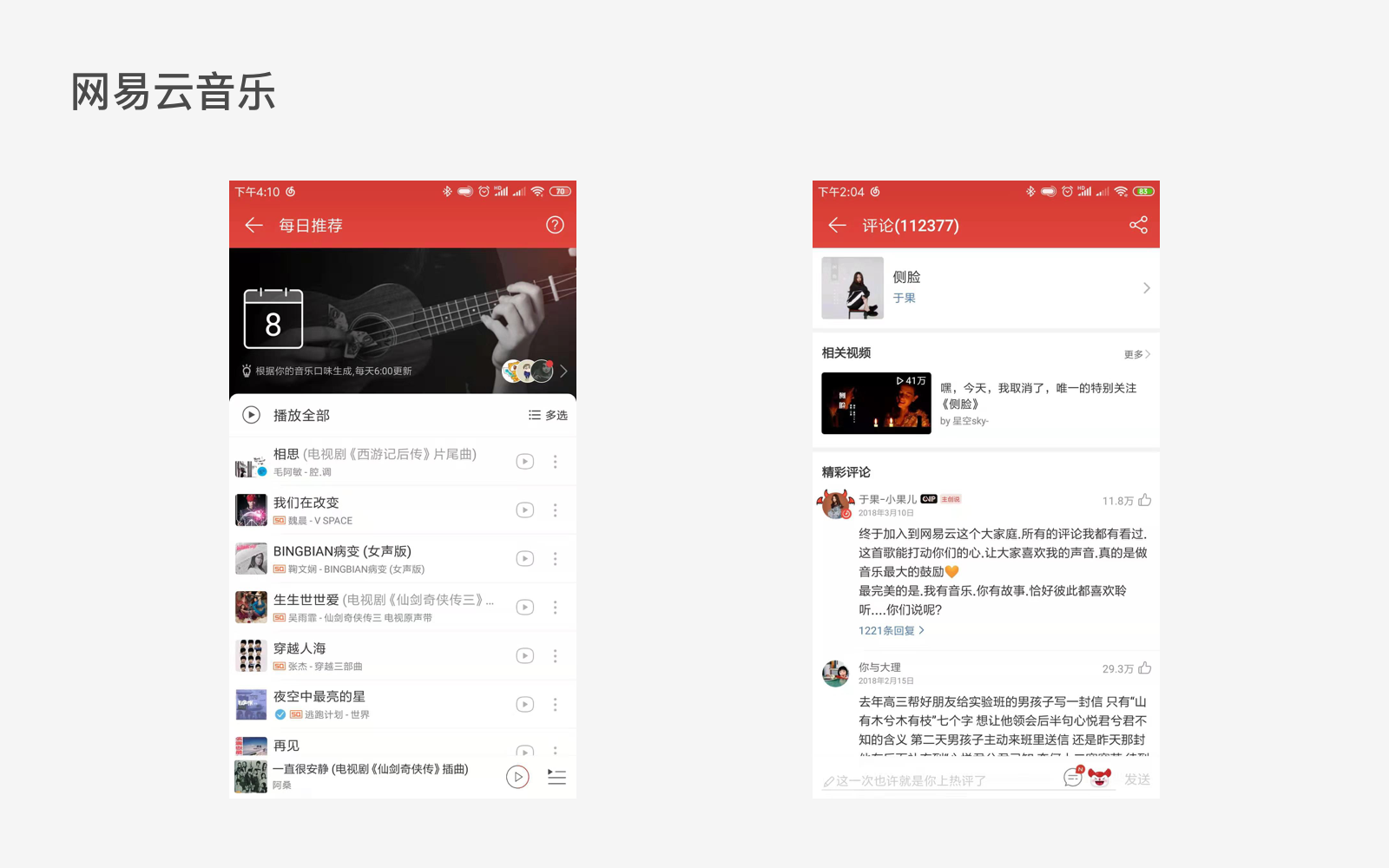 网易云音乐(以下简称云音乐),我个人非常喜欢的一款音乐软件。在国内音乐市场几乎被QQ、酷狗、虾米等众多音乐软件瓜分了大部分市场的情况下,云音乐以一匹黑马的姿态,凭借“音乐社交”的差异点切入市场,并在短短几年内突破2亿用户量。说到这不得不谈一下云音乐设计中的同理心。用过云音乐的用户应该都很喜欢“每日推荐”这个功能,每日推荐共有30收歌曲,每天06:00更新(选择在线用户最少的时间收集最多的口味数据,让更新后的日推更准)。我们常在歌曲的评论区看见“日推,赞!”或者“果然还是云音乐最懂我”等评论,说明该功能深受用户喜爱(此功能让用户感觉到自己被重视)并且所用算法十分精准。用户可在日推列表对歌曲进行批量收藏或下载,也可单独进行操作。另一个功能就是“评论”功能,据不完全统计,有很多人就是为了看评论而打开APP,更有很多人把自己对生活的感慨都写进评论里,这种对产品的信任感和参与感以及被其他用户的认同感会让用户得到极大的满足,甚至上瘾。