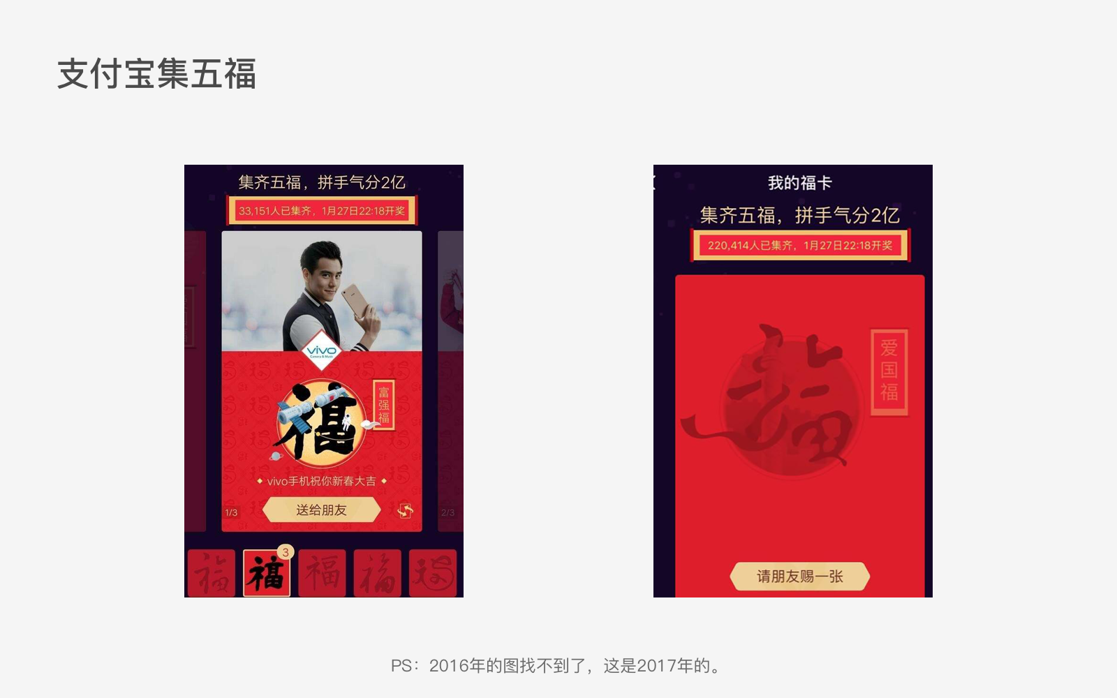 看到这张图大家应该猜到我想要表达的内容了。没错,就是2016年支付宝的“集五福”活动,大家都记得当时的玩法就是集齐五福,分2亿现金。当时的情况是很多人都集齐了四福,差最后一个敬业福(甚至有些人为了集齐五福找一些渠道专门去买敬业福)。支付宝官方微博后来说,一共发出82万多张敬业福,而最后成功集齐五福的是79万。如果按照2000万用户参与支付宝集五福的活动,拿到奖的只有4%,没拿到奖的有96%。也就是说,绝大多数人辛辛苦苦的每天扫福字,集福卡却什么都没得到,这就让很多人不爽了啊。不过好在支付宝转变了策略,后来的集五福活动,只要是参与,基本是人人有奖了。
