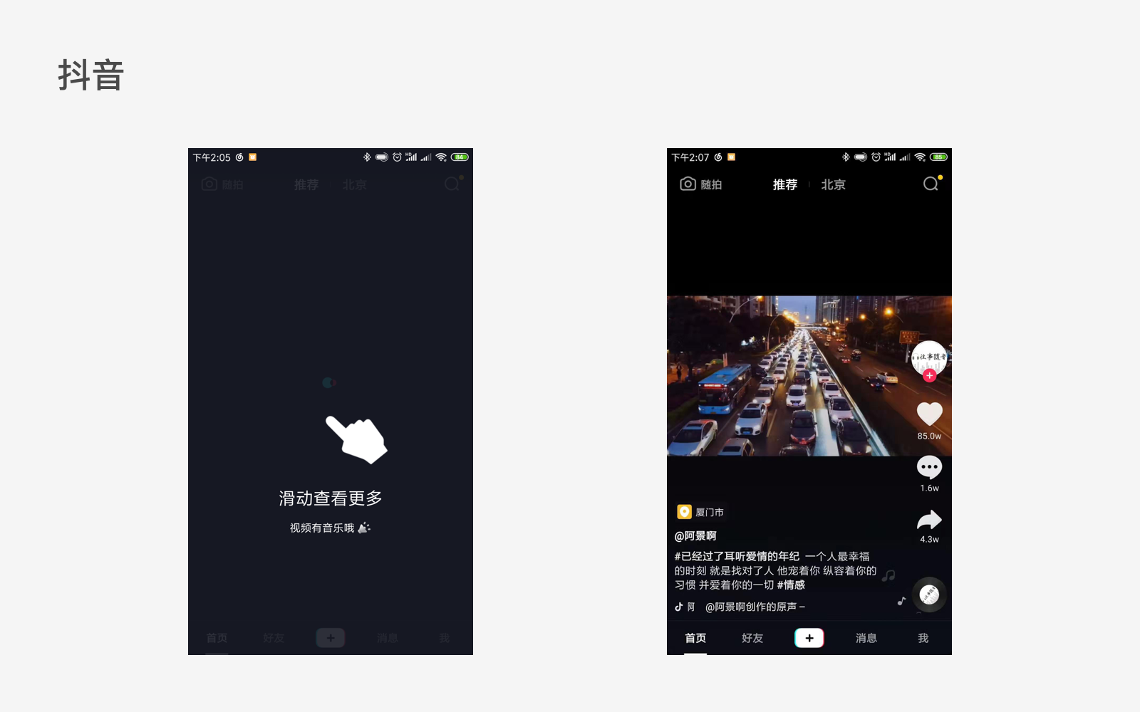 抖音作为短视频领域出来没多久的一款app,他能够在很短的时间内就冲上短视频领域的前几名自然是有它的原因的。首先,抖音的用户学习成本极低,第一次打开产品就会有“滑动查看更多”的交互提示,没有其他任何多余操作,你只需要不停地滑就可以了。其次,抖音的登录操作不靠前,如非必要可以一直以游客的身份无限的“刷”下去。然后,就是其恐怖的沉浸式浏览设计,视频全屏展示,所有操作按钮都是悬浮于视频之上,向下滑动则切换视频,切换的同时第二个视频便自动播放,只要视频内容足够优质,就能让人根本停不下来。(题外话:抖音虽好,可不要沉迷呦!)