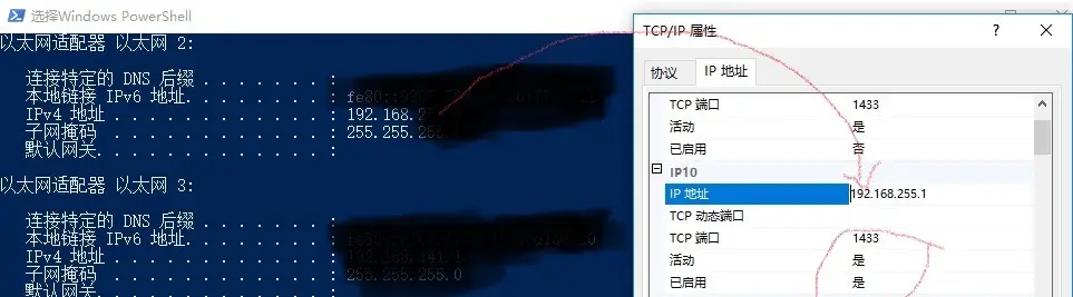 SQLServer Configuration Manager中的客户端协议,众多IP中随便选一个,比如我选了“IP10”然后IP地址改为现在使用的网络的IP地址,然后把它启用。可以观察到默认状态下所有IP的“已启用”选项都是否。