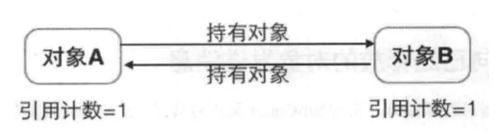 产生原因:如下图所示,对象A和对象B相互引用了对方作为自己的成员变量,只有自己销毁的时候才能将成员变量的引用计数减1。对象A的销毁依赖于对象B的销毁,同时对象B销毁也依赖与对象A的销毁,从而形成循环引用,此时,即使外界没有任何指针访问它,它也无法释放。