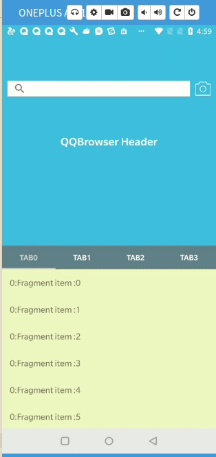 步骤跟上面的仿 QQ 浏览器的步骤是一样的,这里不再重复相同的步骤,说几个关键点:第一:在页面 header close 的时候,我们可以通过滑动打开header,这是通过调用 mHeaderBehavior.setCouldScroollOpen(true); 实现的。第二:滑动 header, fling 的时候,可以看到 content 部分的 recyclerView 也在滑动,我们是通过 header 的 fling 事件做到的,在 onFlingStart 的时候手动调用 RecyclerView 的 smoothScrollBy 进行滑动。