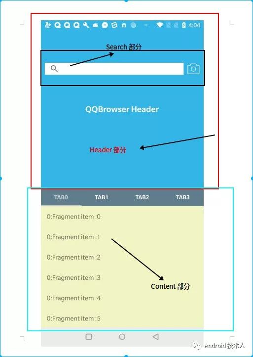 第一部分 Header 部分:在 Header 部分还没有滑动到顶部的时候(即 open 的时候),跟随手指滑动第二部分 Content 部分:我们向上滑动的时候,当Header 处于 open 状态,这时候 Header 向上滑动, content 部分的 recyclerView 不会滑动,当 header 处于 close 状态,content 部分向上滑动, RecyclerView 向上滑动。当我们向下滑动的时候,header 并不会随着滑动,只会滑动 content 部分的 recyclerView第三部分 search 部分:当我们向上滑动的时候,Search 部分会随着滑动,最终停留在固定的位置.