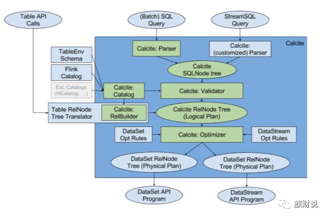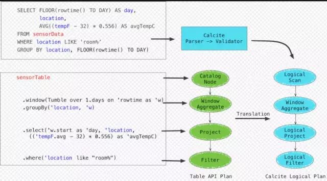 其完全依靠calcite(sql parser)去做语法解析,validate后生成calcite logical plan. 而Table API先自己生成table API的logical plan,再通过calcite relbuilder translation成calcite logical plan。