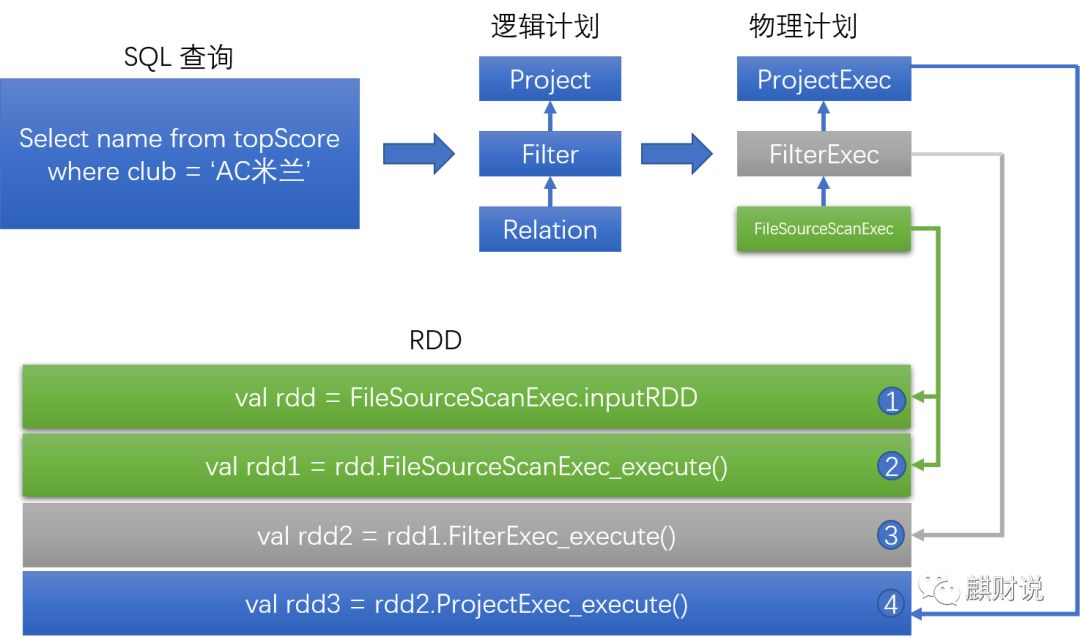 一段SQL为例,Select* from topScore where club = ‘AC米兰’ 生成的逻辑计划树中有Relation、Filter、Project三个子节点对应数据表、过滤逻辑(club=‘AC米兰’)和列剪裁逻辑(只涉及2列[name,club])。接下来物理计划和逻辑计划一一映射,Relation逻辑节点转化成FileSourceScanExec执行节点,Filter逻辑节点转换成FilterExec 执行节点,Project逻辑节点转化成ProjectExec执行节点。生成的物理执行计划与直接执行RDD程序相似。