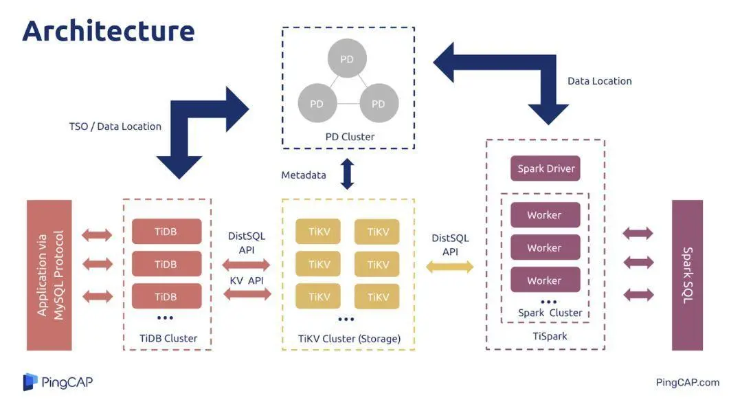 我们 Team 主要负责 TiKV 的研发工作,下图是我们产品的架构图,大家可以看到,无论是 TiDB 还是 TiSpark,都是从 TiKV 存取数据的,所以我们一定要保证 TiKV 的稳定和高效。