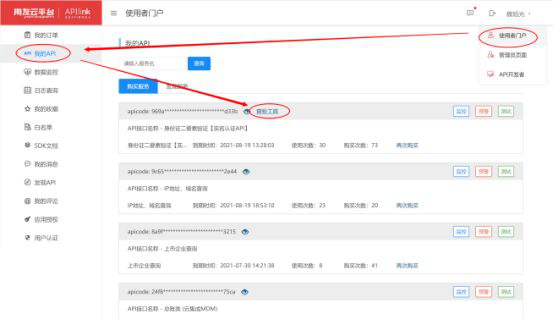 2.完成后,点击右上角的ID,并依次选择 “使用者门户”-“我的API”,点击“身份证二要素实名验证”旁边的“查验工具”,就能找到将身份核验效率提高1000倍的神器啦~