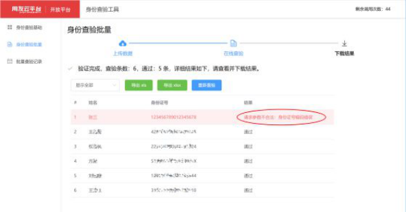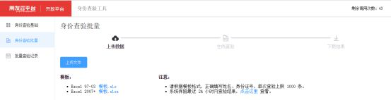 “身份查验批量”适用于批量查询姓名与身份证号,下载模板并按要求录入所要查询的姓名与身份证号信息,然后上传此文件,就可以批量查询身份信息了,单次最多查验1000条数据。