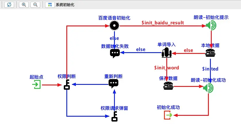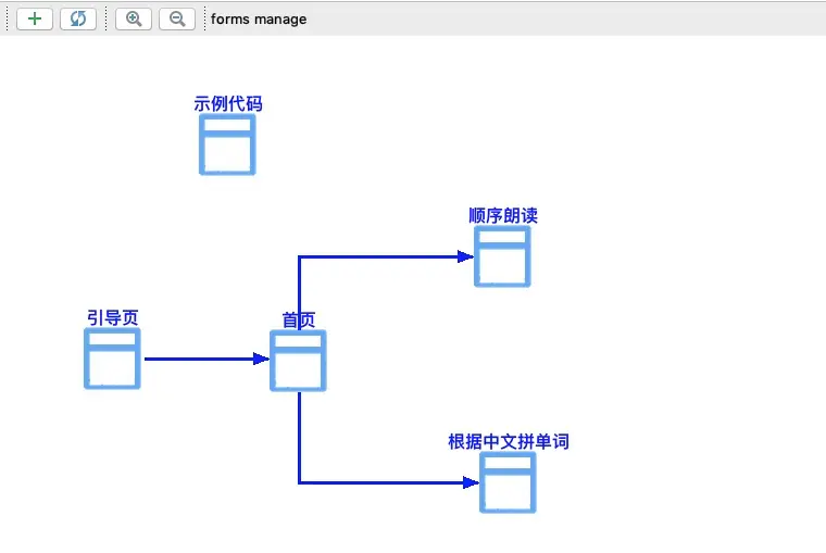 流程 相关联流程拖拽到一起,通过双击或选中后的属性按钮定位具体流程实现,跳转目标可配置 points.json R.groovy