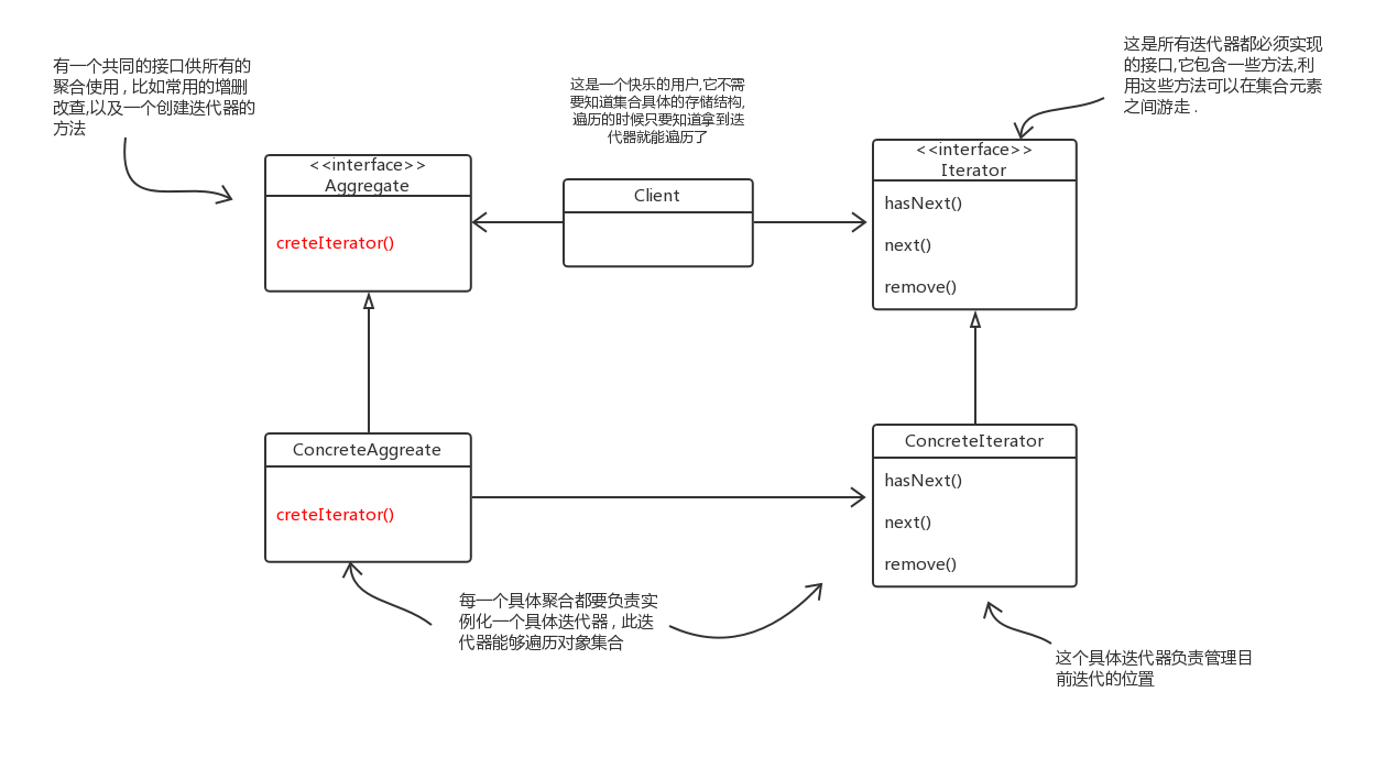 - 对于客户来说 , 不再关注聚合遍历的具体实现, 只需要拿到该聚合对应的迭代器 , 就能轻松进行遍历了,将客户与遍历具体实现进行了解耦