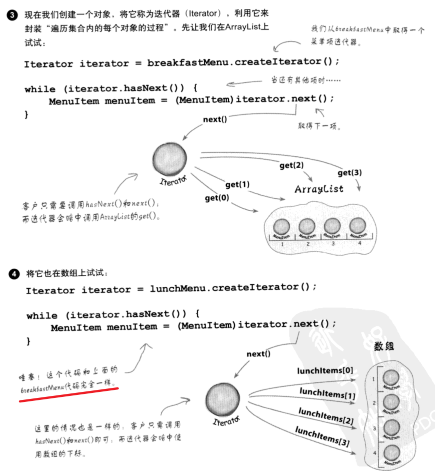 封装遍历, 将遍历元素的动作抽取出来, 将女招待解耦了.女招待无需知道菜单列表是如何被实现的)