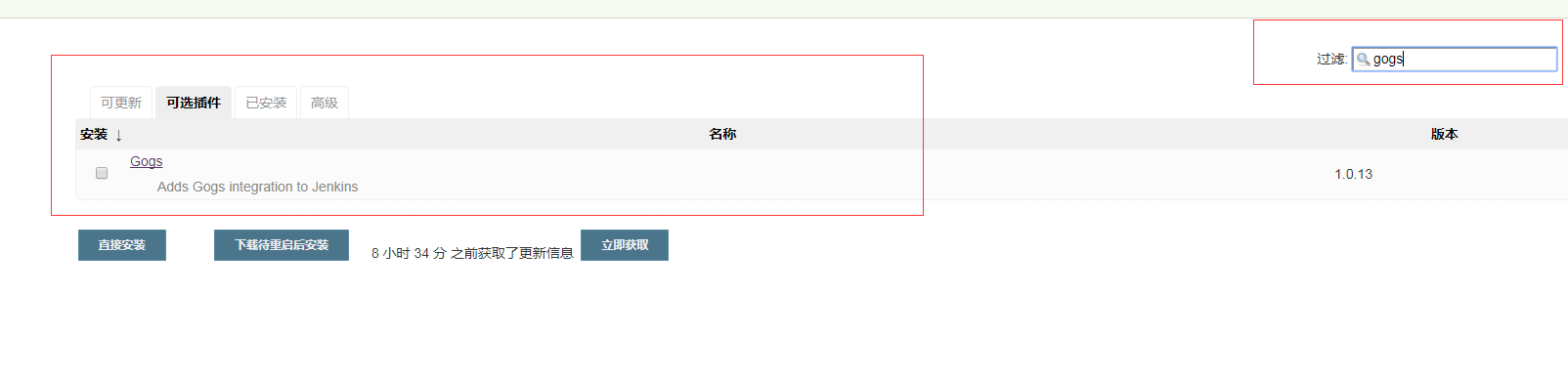 打开 系统管理 -> 管理插件 -> 可选插件 ,在右上角的输入框中输入“gogs”来筛选插件: