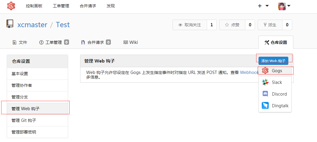 点击 管理Web钩子 -> 添加Web钩子 ->选择Gogs