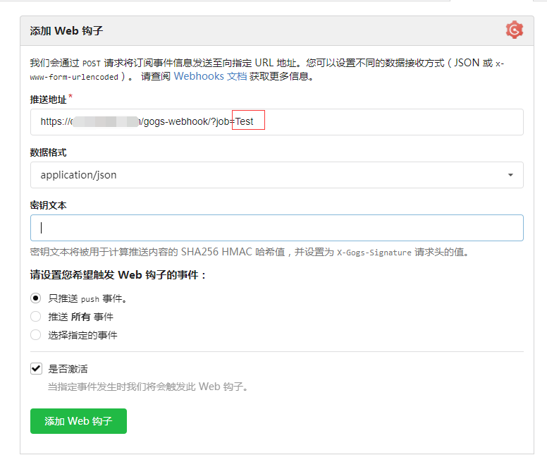 推送地址的格式为:http(s)://<你的Jenkins地址>/gogs-webhook/?job=<你的Jenkins任务名>