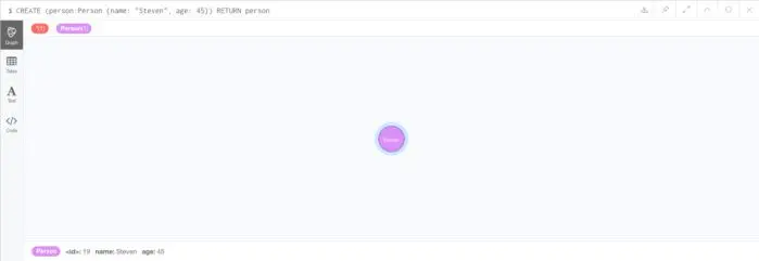 在图5中,您可以看到一个标记为Person且名称为Steven的新节点。如果将鼠标悬停在Web控制台中的节点上,您将在底部看到其属性。在这种情况下,属性是ID:19,名称:Steven,年龄:45。现在让我们分解Cypher查询: