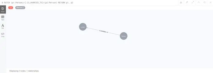 我们有四个节点,所以让我们创建一些关系。首先,让我们创建史蒂文和琳达之间的IS_MARRIED_TO关系: