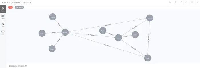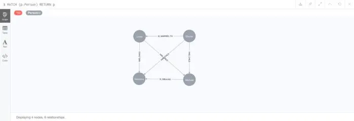 创建四个人后,您可以单击节点标签下的“ 人员”按钮(如果单击网页左上角的数据库图标,则可见)或执行以下Cypher查询: