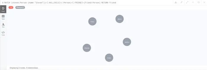 在此查询中,我们从名为“Steven”的HAS_CHILDPerson节点开始,遍历所有与Person节点的FRIEND关系,遍历所有Person节点的关系,并返回朋友列表。我们可以包含方向关系,但省略箭头可以让我们遍历两个方向。
