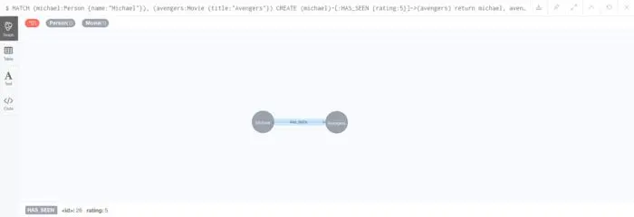 MATCH (michael:Person {name:"Michael"}), (avengers:Movie {title:"Avengers"}) CREATE (michael)-[:HAS_SEEN {rating:5}]->(avengers) return michael, avengers