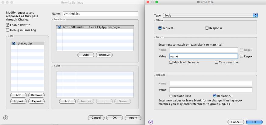 在Charles菜单栏 -> Tools -> Rewrite中可以开启Rewrite功能,点击Add 按钮可以添加一条设置,并可以在右侧的Locations和Rules中分别添加要Rewrite的请求路径和Rewrite规则。图示如下: