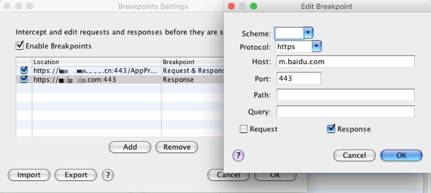 点击Breakpoints后即为该请求设定了断点。默认情况下,在该请求的Request / Response过程都会受断点控制,即在Request数据发送到的服务端之前会被暂停,在Response数据发送到客户端之前也会被暂停。可以从Charles 菜单栏 -> Proxy -> Breakpoint Settings中编辑断点的参数。比如,只需要对Response过程加断点,可以将Request的勾选状态取消。图示如下: